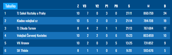 Harmonogram utkání: 9:00 hod. TJ Sokol Roztoky - SK Volejbal Kolín 11:00 hod. TJ Sokol Roztoky - VK Hronov 13:00 hod. TJ Sokol Roztoky - SK Volejbal Kolín 15:00 hod. TJ Sokol Roztoky - VK Hronov